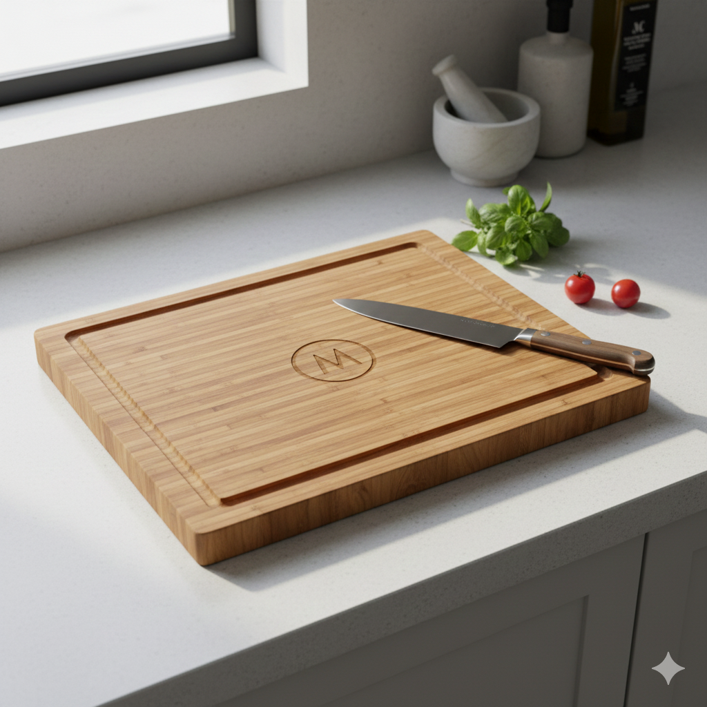Prémium bambusz vágódeszka lézergravírozott emblémával.
